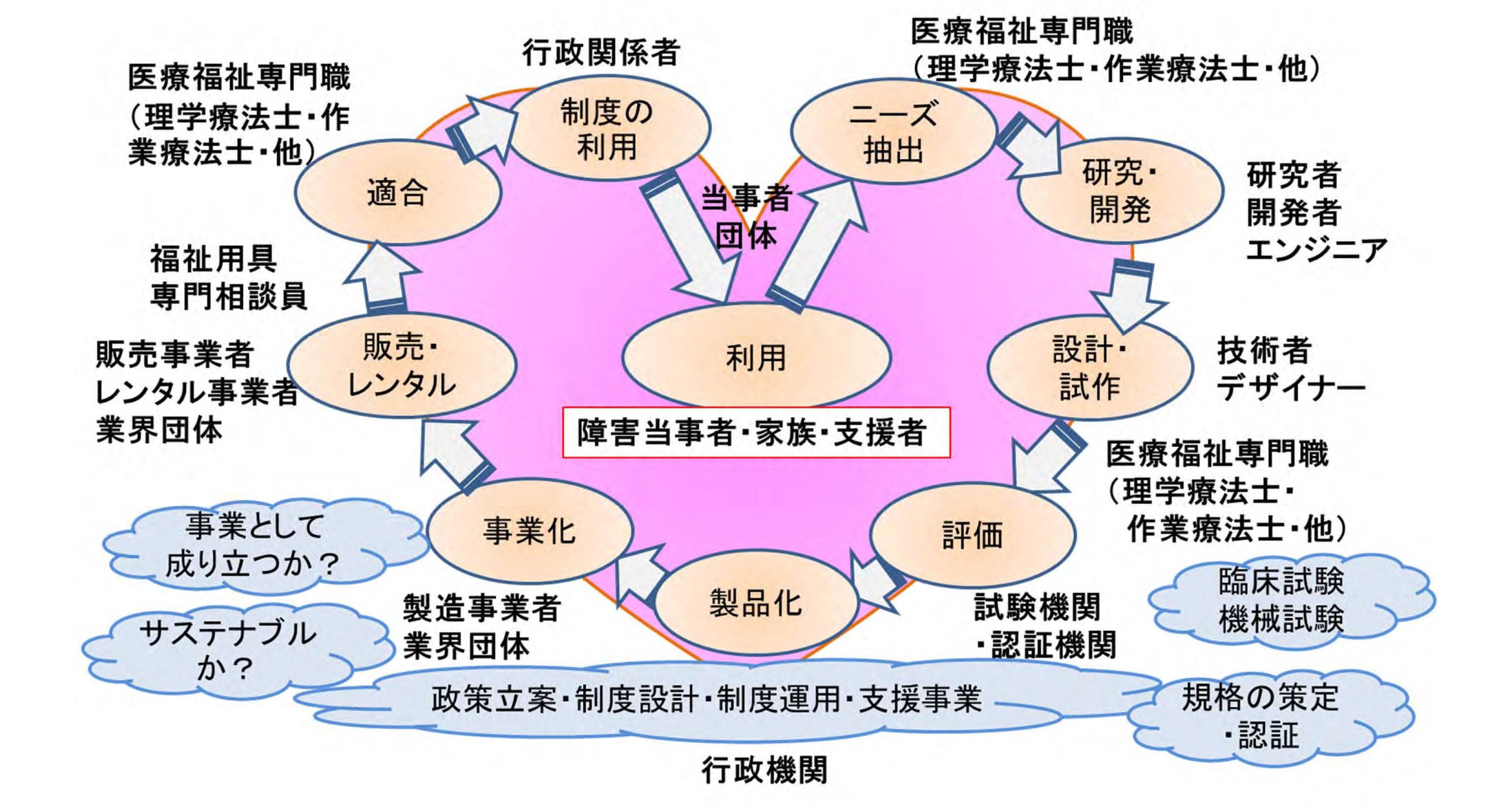 前述の生活支援技術革新ビジョン勉強会の報告書を基に、支援機器の開発と普及の流れとステークホルダー(利害関係者)の関係を示すハートサイクルの図が作成されました。